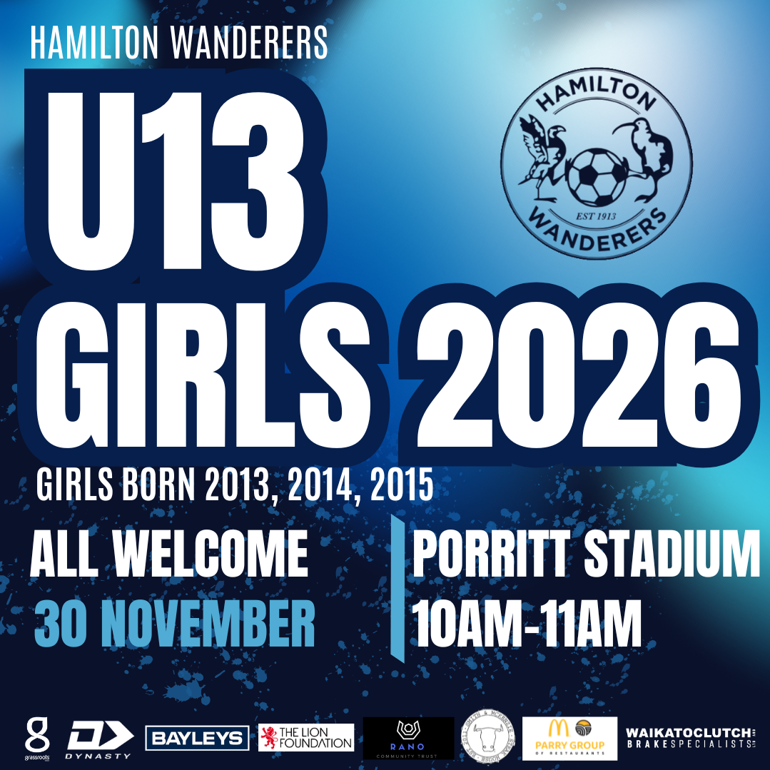 This is your chance to join the Hamilton Wanderers new U13 Waibop Kaimai Girls team for 2026. This opportunity is open to all girls born 2013, 2014, 2015.