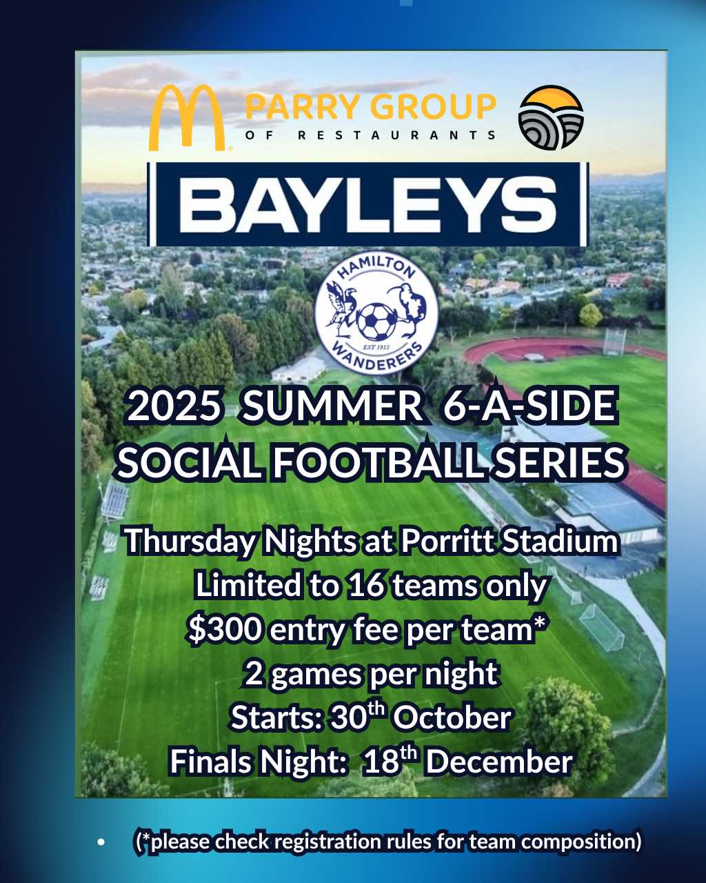 Grab your mates, whanau, work colleagues and put together a team for our Thursday night 6 aside at Porritt Stadium.